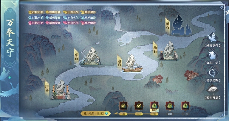 1月8日更新后,各位同门即可通过万奉天宁主界面,了解自己的【侠义】【谋略】【声望】以及大宋的【社会风气】。