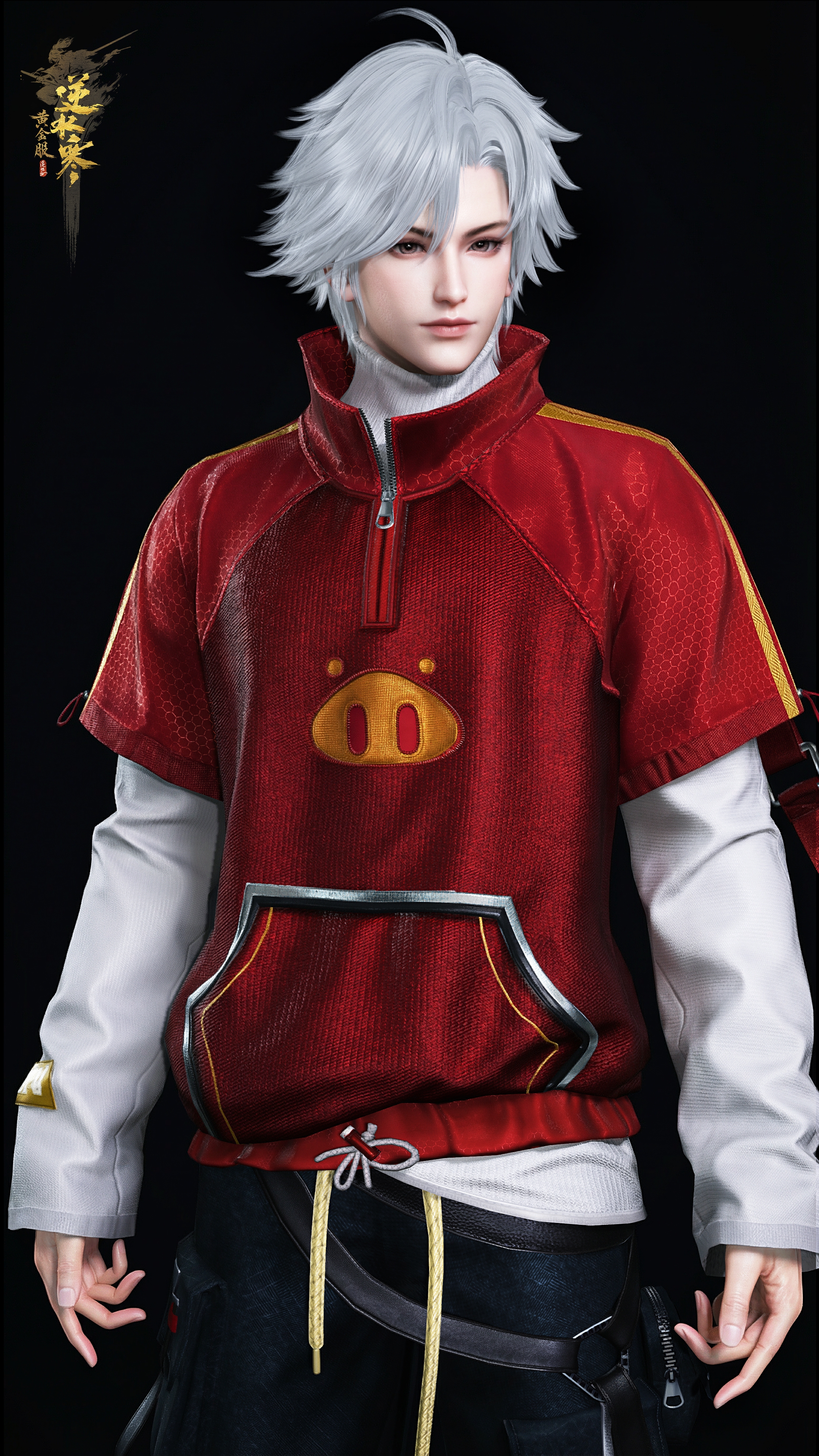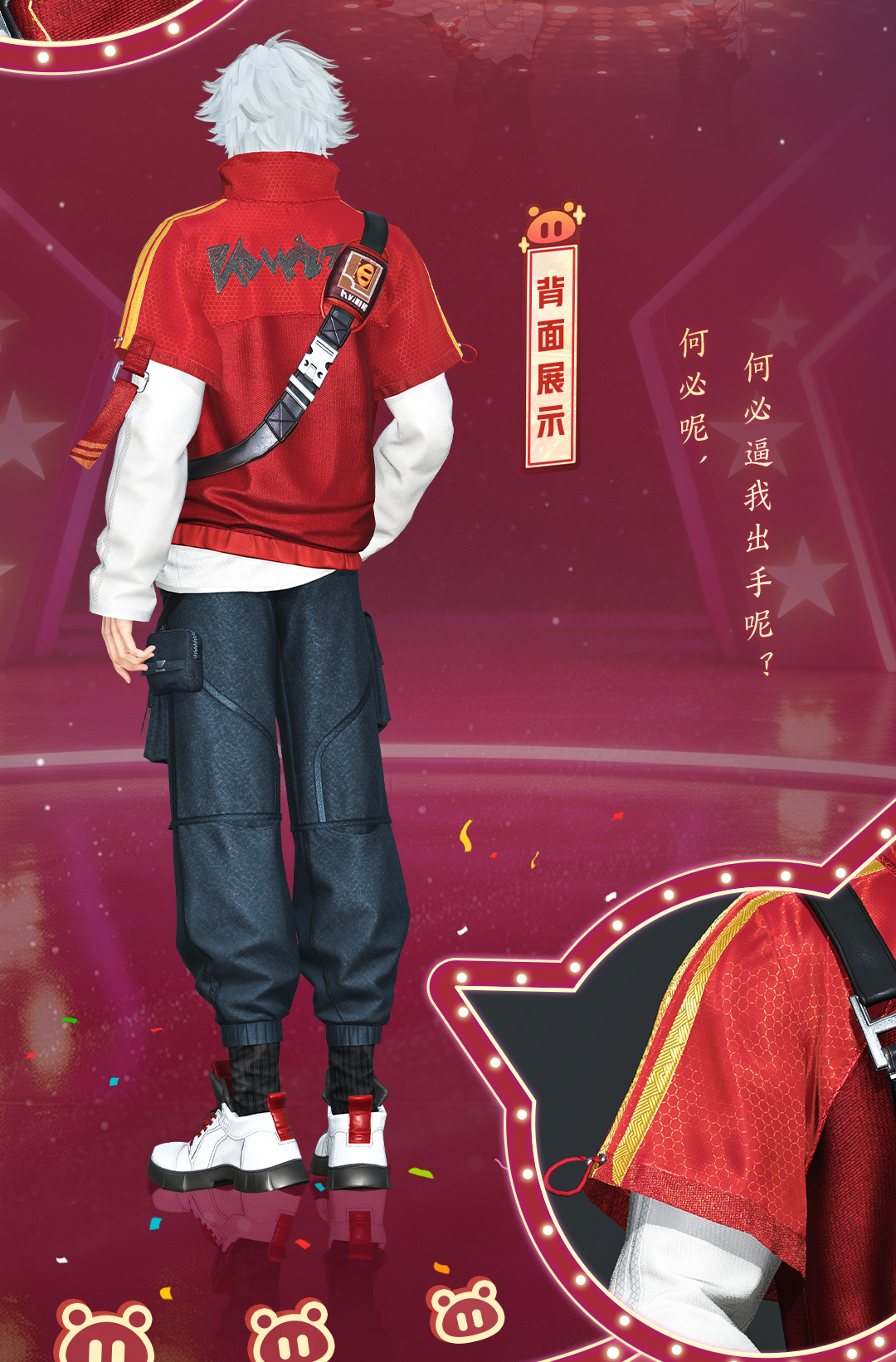 猪猪侠同款时装【居居勇者】英俊帅气,红色半袖卫衣采用猪猪侠“战衣”的火红金黄配色,热情洋溢又意气风发。搭配白色长袖内搭与帅气的黑色工装裤,再背上一个炫酷的黑色斜挎包,青春潇洒的气息都要溢出屏幕了!